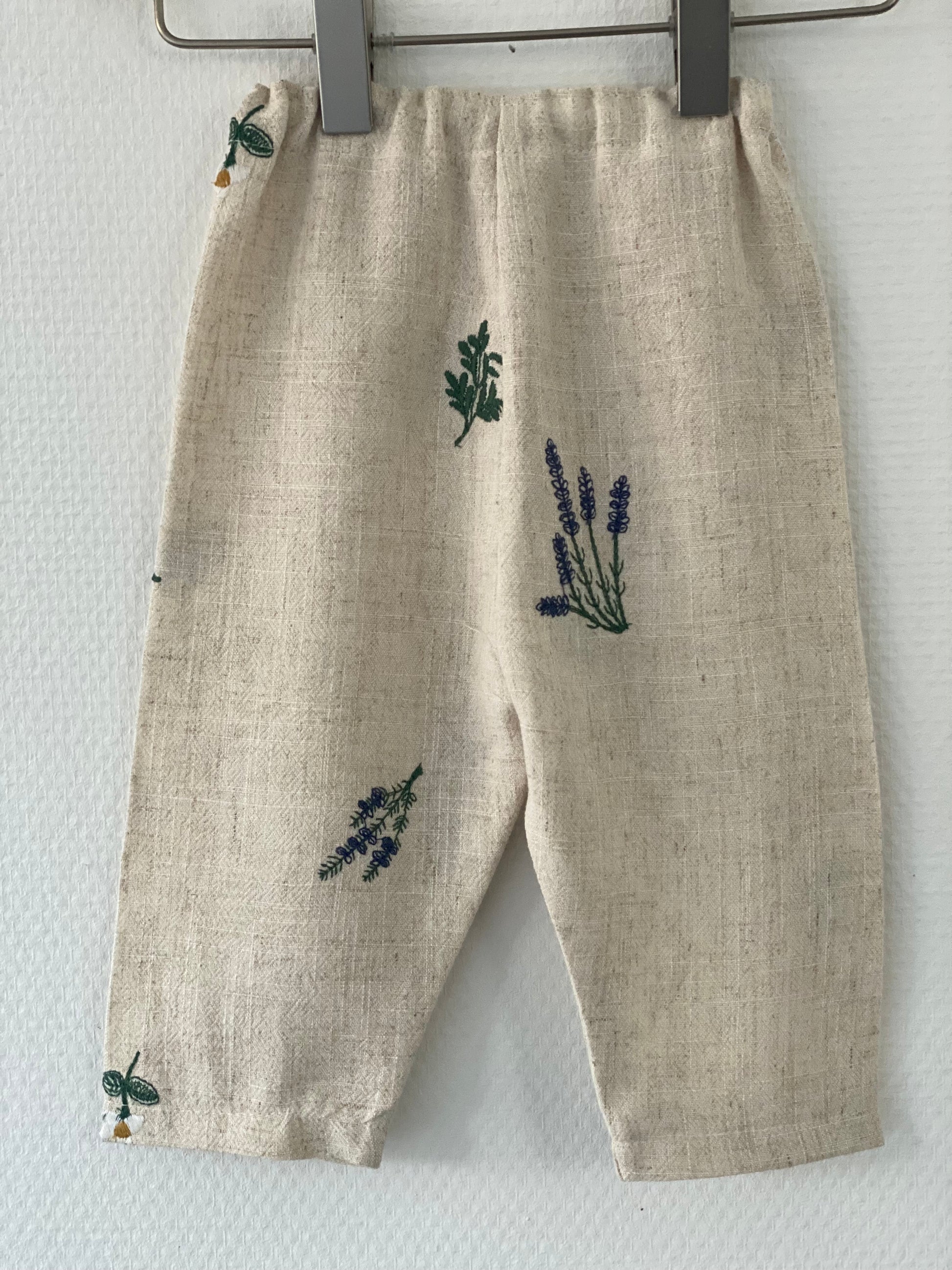 Et par søde bukser med broderede blomster. Bukserne er behagelige at have på og giver god bevægelsesfrihed, hvilket gør dem ideelle til både hverdag, leg og små eventyr. De kan styles med både bluser, skjorter og strik.