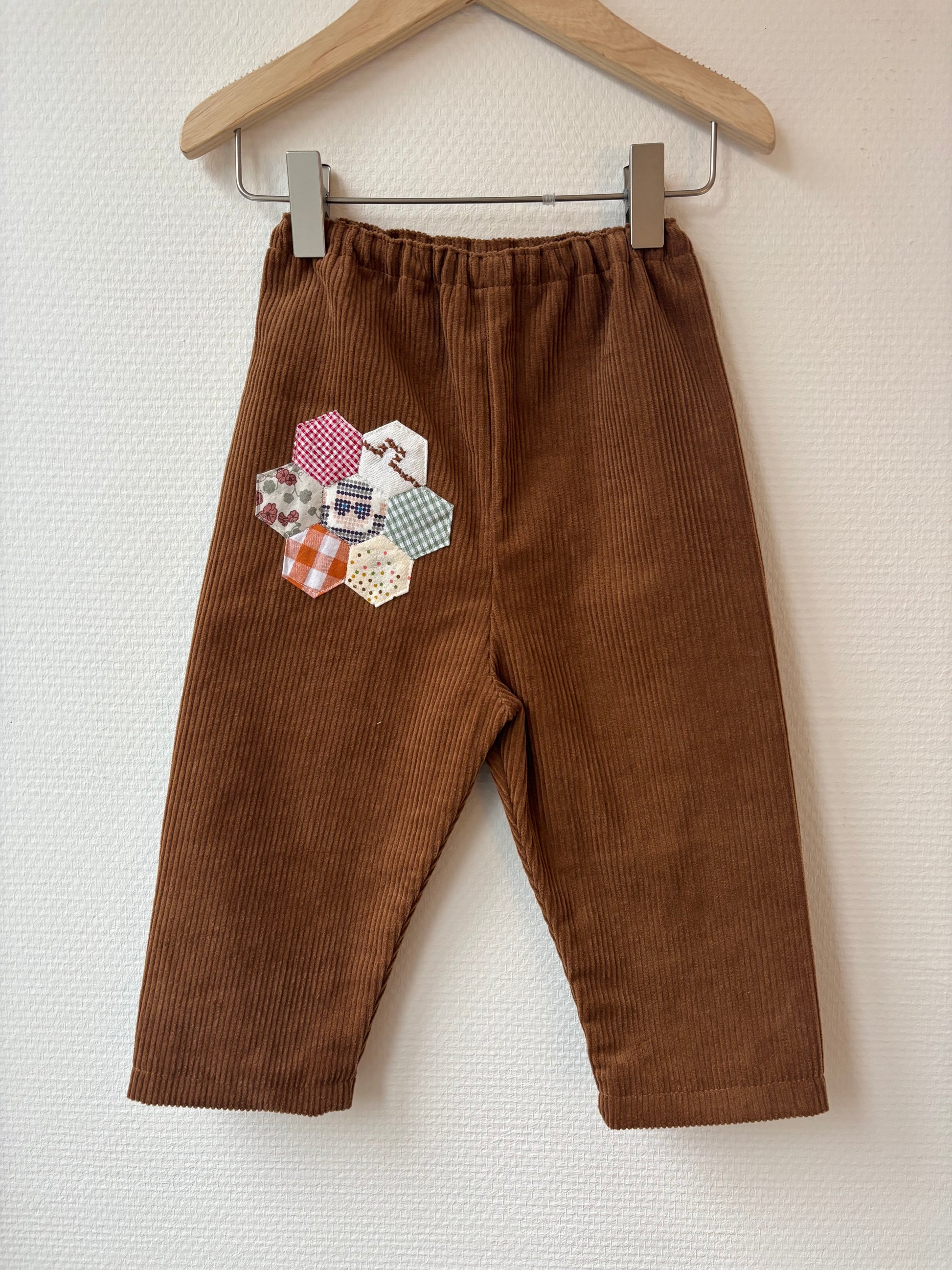 Et par søde brune, fløjlsbukser med påsyede, håndlavet patchwork blomst. Bukserne er behagelige at have på og giver god bevægelsesfrihed, hvilket gør dem ideelle til både hverdag, leg og små eventyr. De kan styles med både bluser, skjorter og strik.