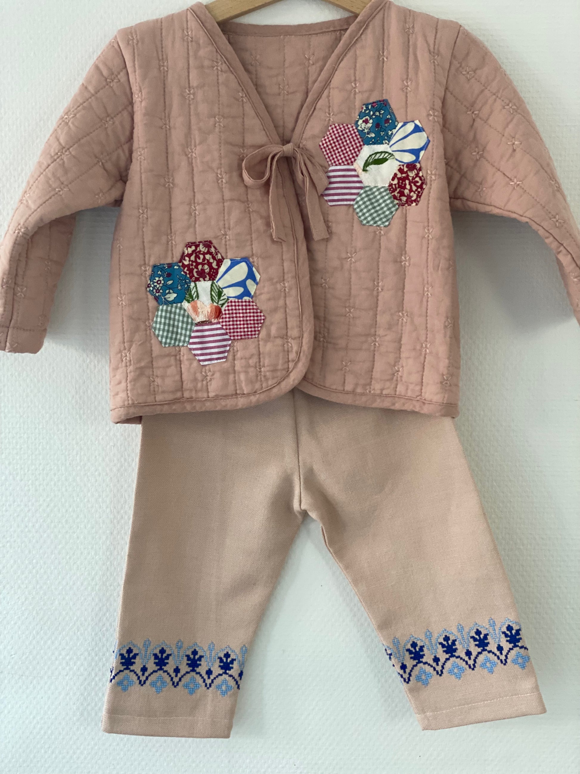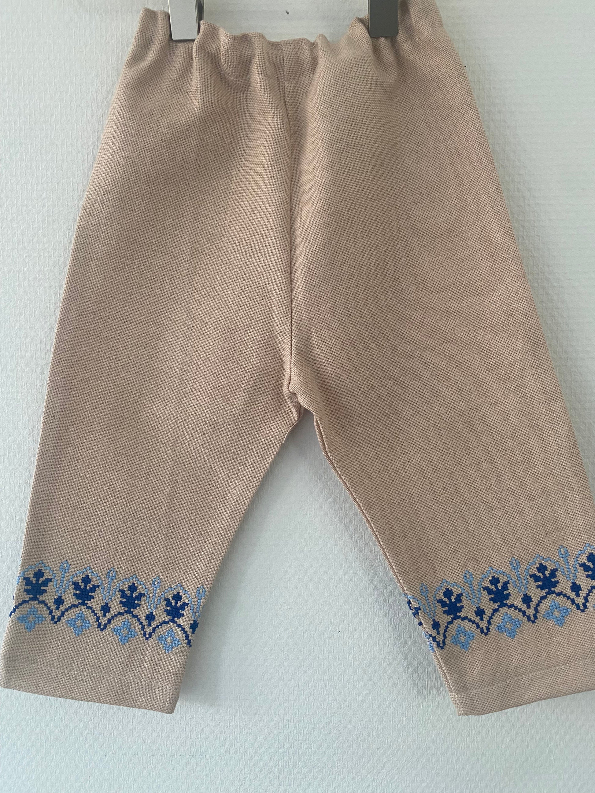 Et par søde bukser med broderede kant lavet af vintage tekstil. Bukserne er behagelige at have på og giver god bevægelsesfrihed, hvilket gør dem ideelle til både hverdag, leg og små eventyr. De kan styles med både bluser, skjorter og strik.