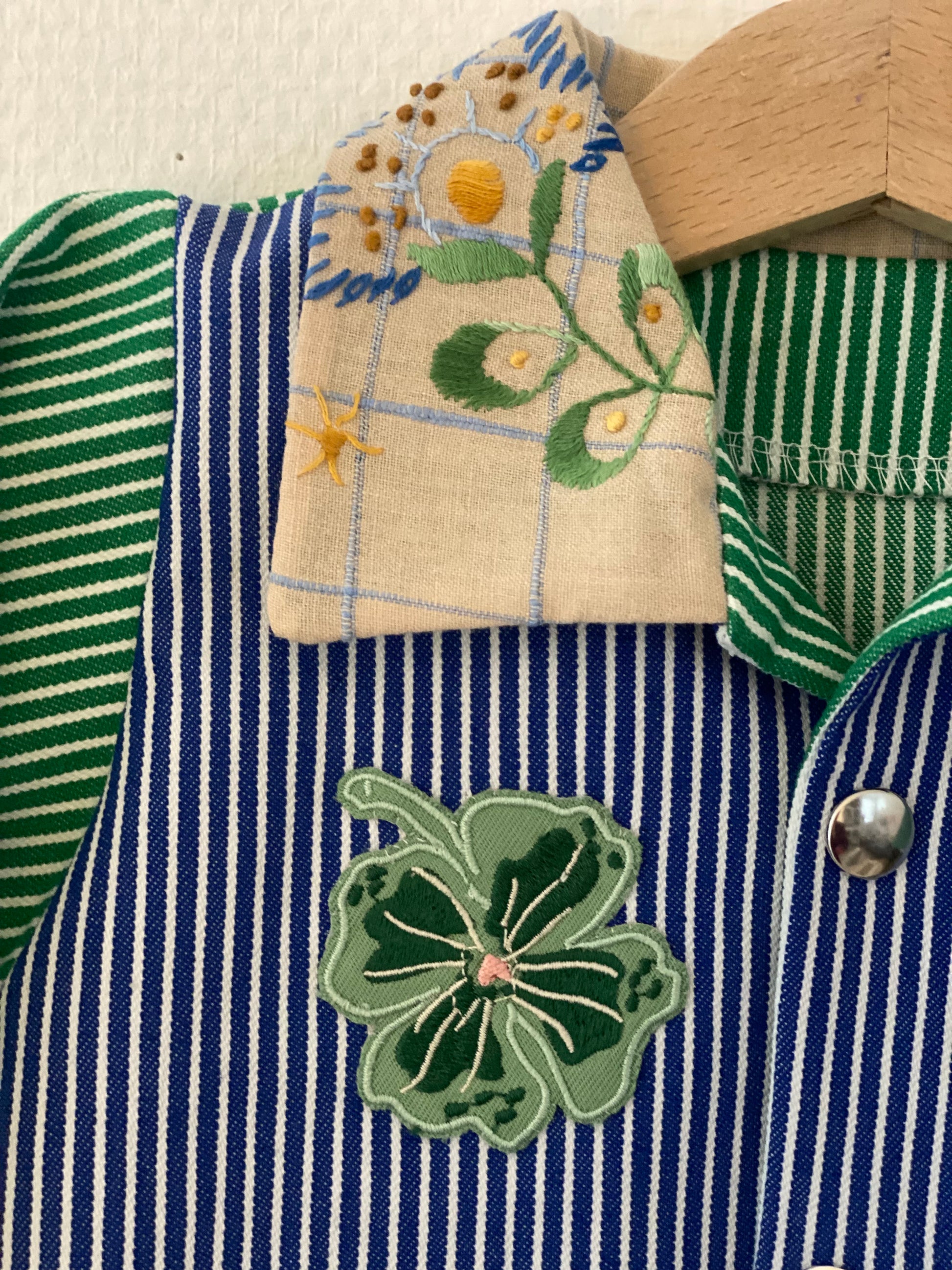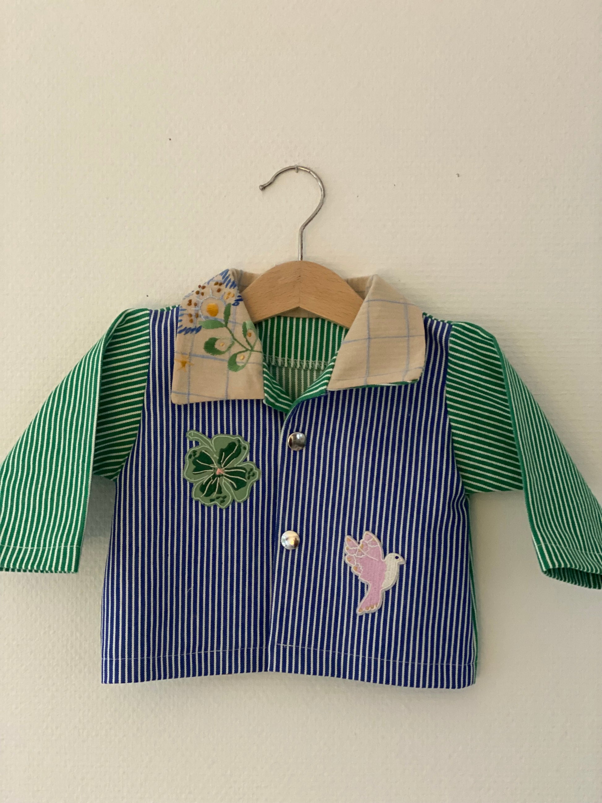 En sød jakke i grøn/blåstriber med søde motiver på. Jakken fungerer perfekt til både børnehave, legeplads og små eventyr. En dejlig jakke som er et oplagt valg til forår og efterår eller kolde sommeraftener. Ønsker du den ekstra personlig, kan du få håndbroderet navn på ryggen.