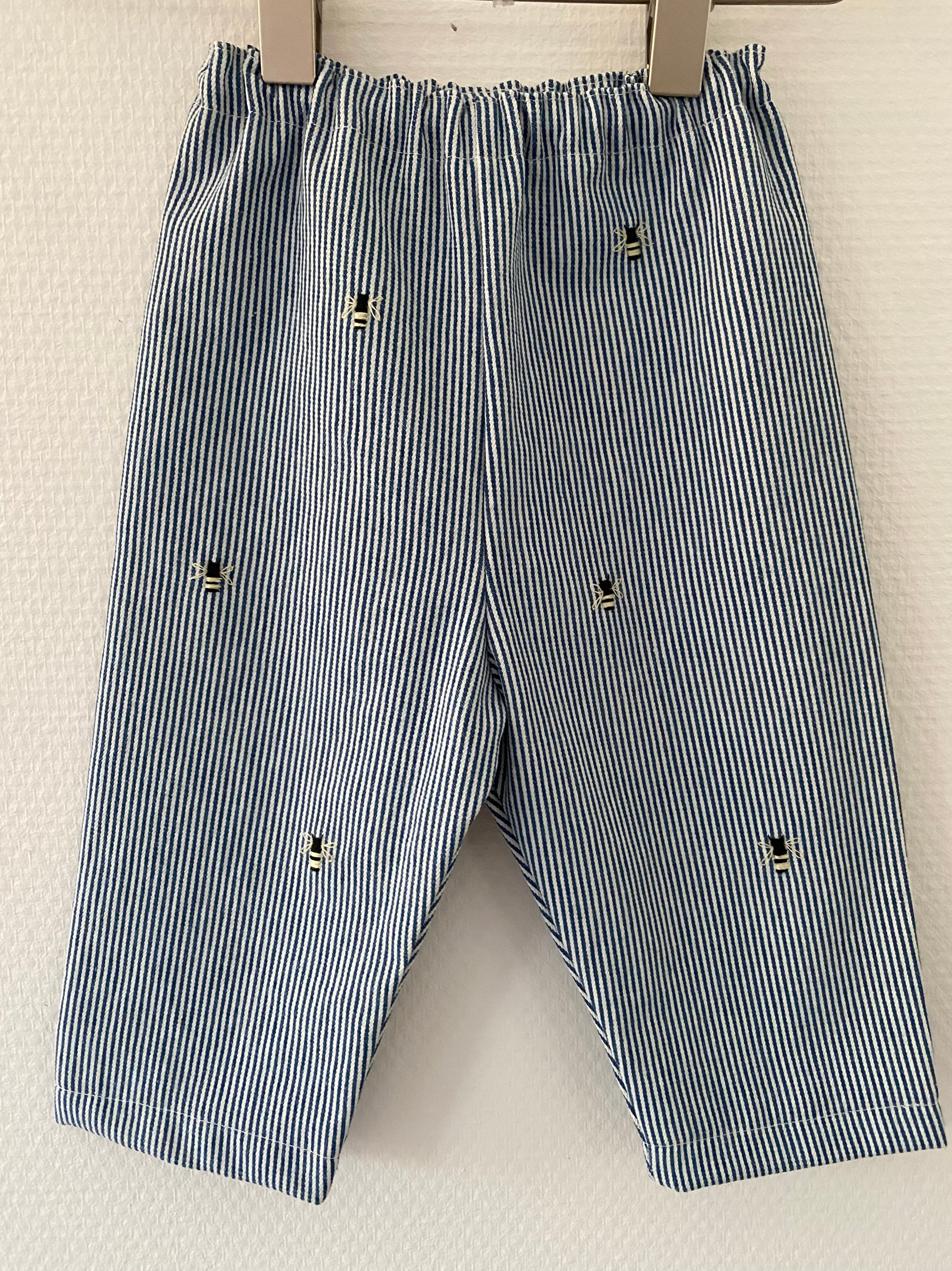 Et par søde blå stribede bukser med håndbroderede bier. Bukserne er meget behagelige at have på og giver god bevægelsesfrihed, hvilket gør dem ideelle til både hverdag, leg og små eventyr. De kan styles med både bluser, skjorter og strik.