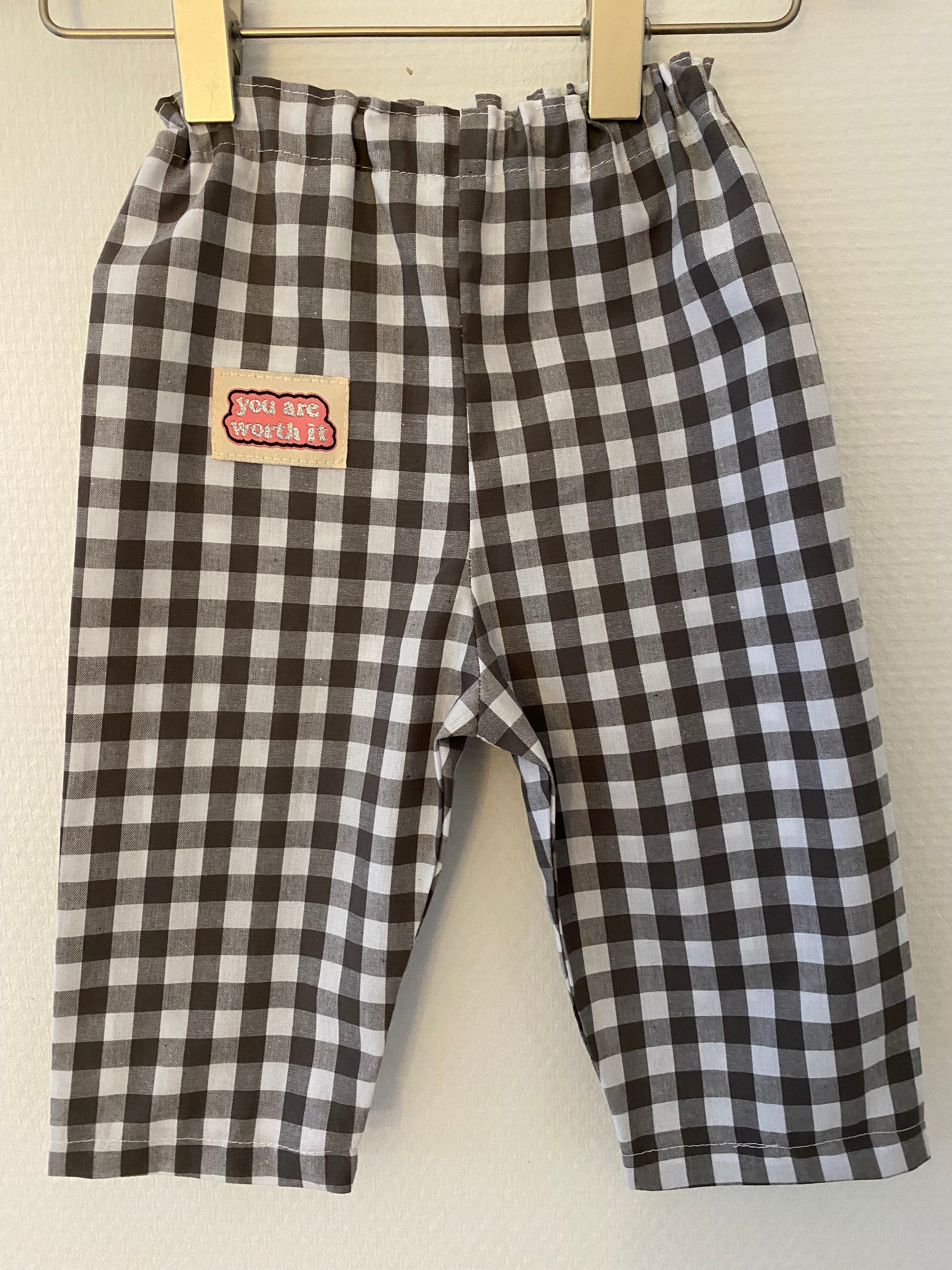 Et par søde, ternede bukser med en sjov detalje. Bukserne er behagelige at have på og giver god bevægelsesfrihed, hvilket gør dem ideelle til både hverdag, leg og små eventyr. De kan styles med både bluser, skjorter og strik.