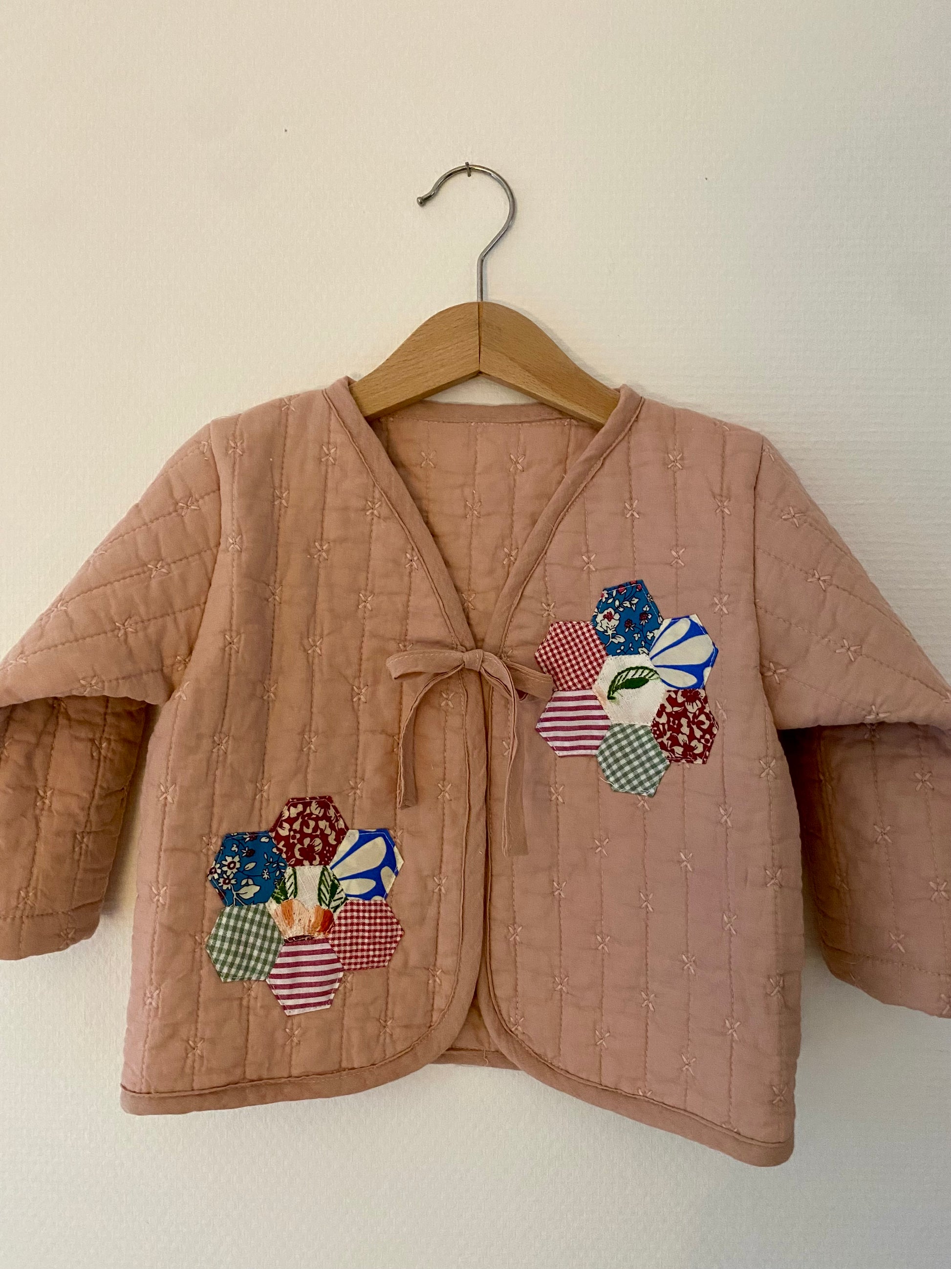 En sød quiltet jakke i den fineste rosa farve med patchwork blomster. Jakken fungerer perfekt til både børnehave, legeplads og små eventyr. En dejlig jakke som er et oplagt valg til forår og efterår eller kolde sommeraftener. Ønsker du den ekstra personlig, kan du få håndbroderet navn på ryggen.