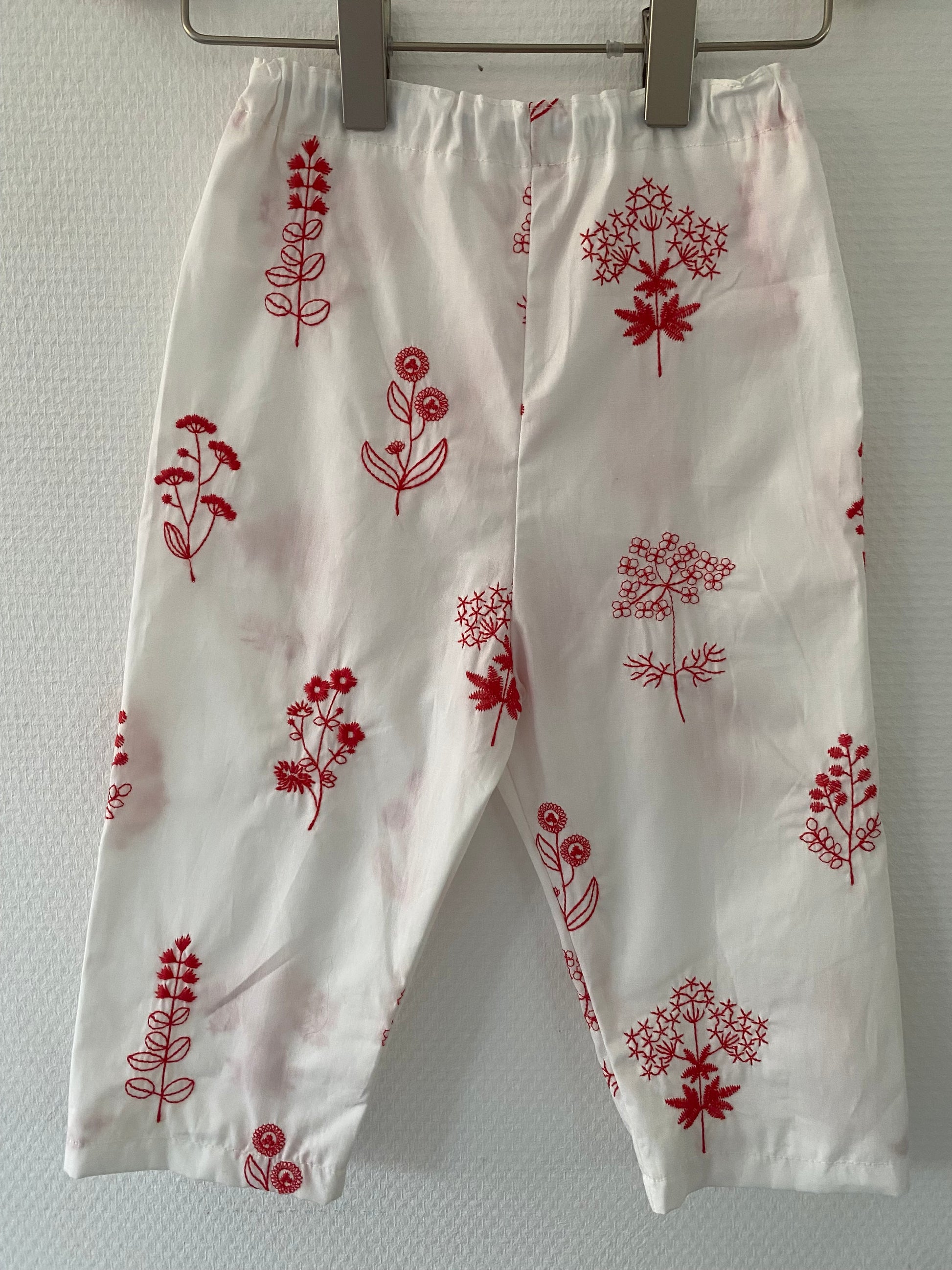 Et par søde bukser med røde broderede blomster på. Bukserne er behagelige at have på og giver god bevægelsesfrihed, hvilket gør dem ideelle til både hverdag, leg og små eventyr. De kan styles med både bluser, skjorter og strik.