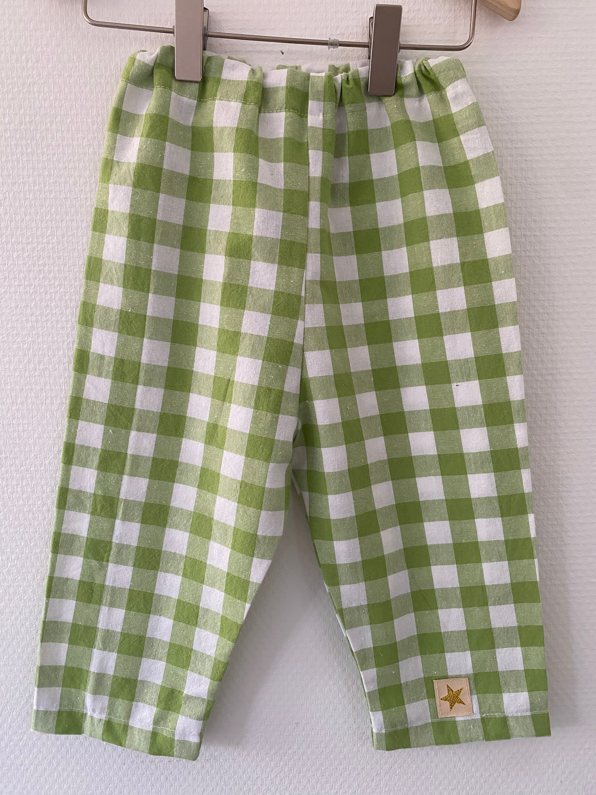 Grønternede bukser med et lille påsyet hjerte. Bukserne er behagelige at have på og giver god bevægelsesfrihed, hvilket gør dem ideelle til både hverdag, leg og små eventyr. De kan styles med både bluser, skjorter og strik.