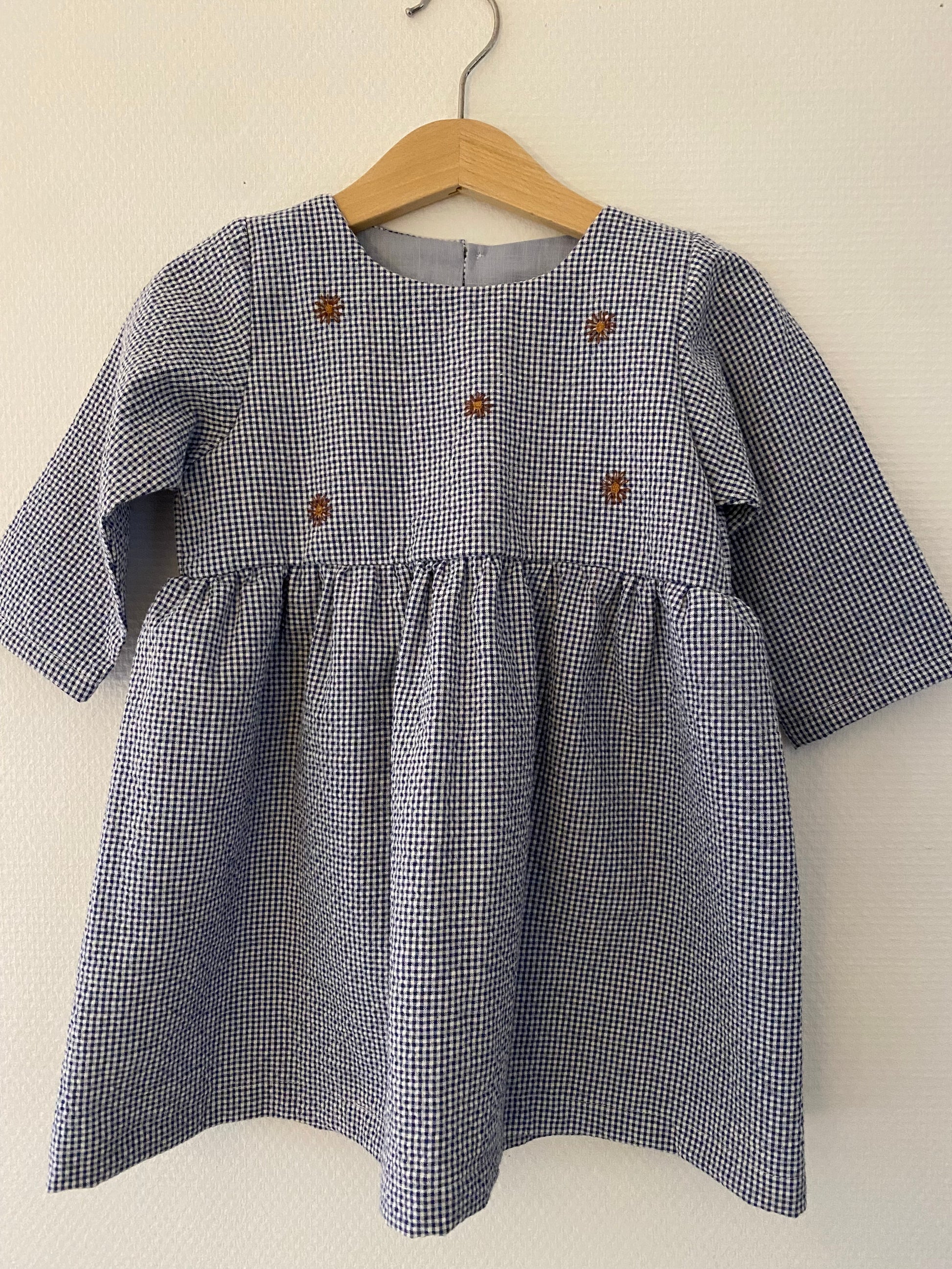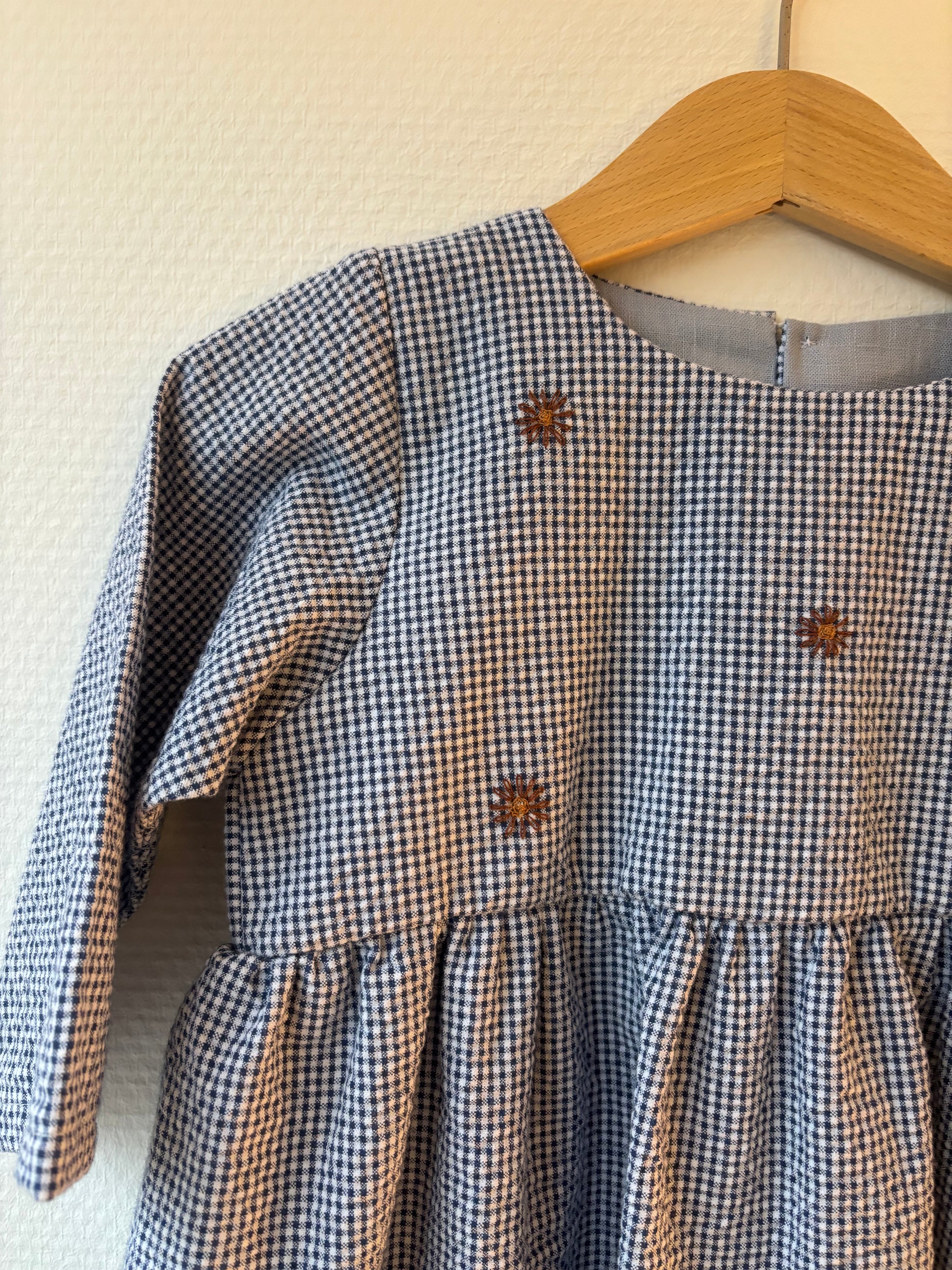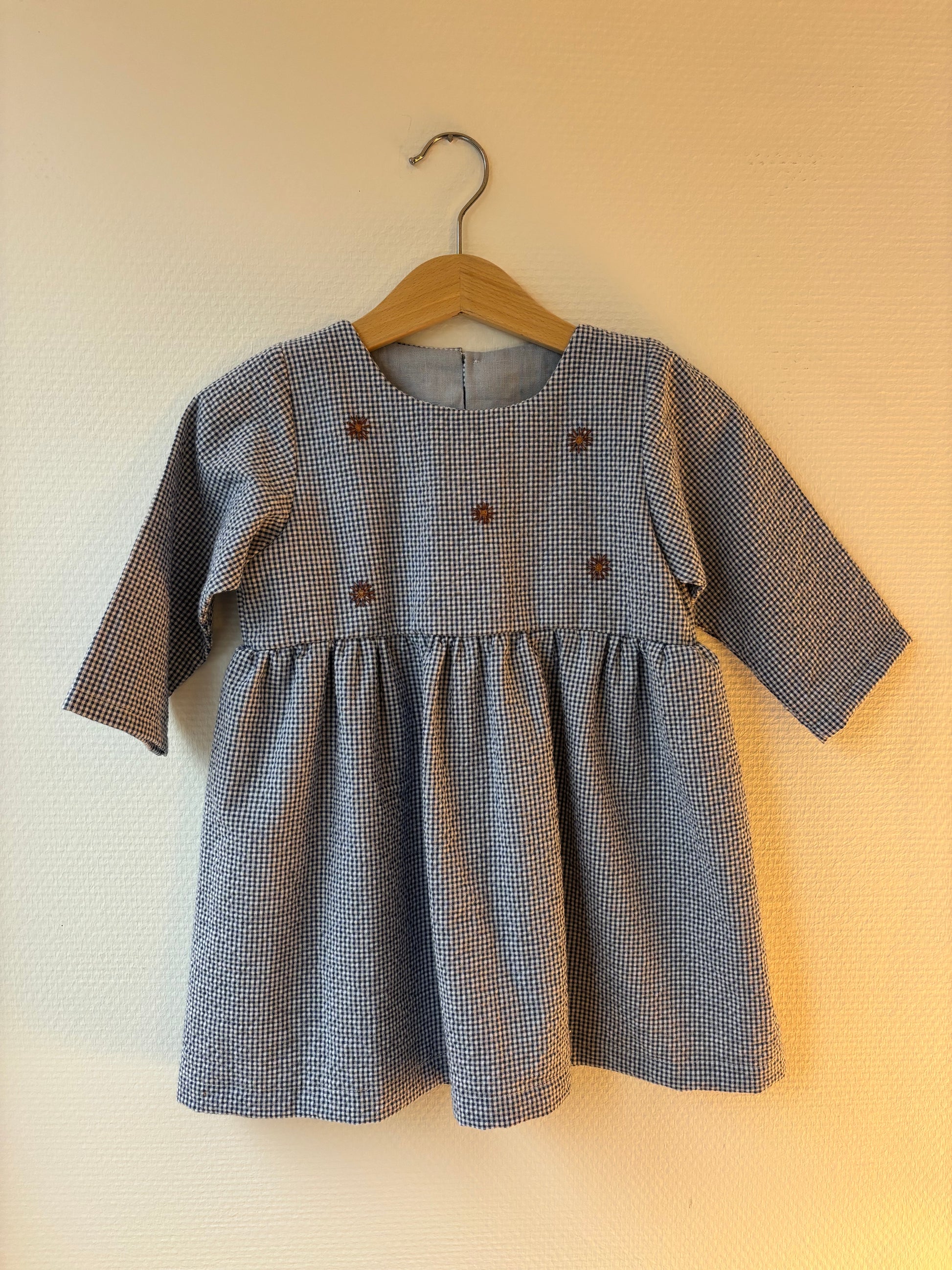 Blåternet kjole med håndbroderede blomster på. Kjolen er behagelig at have på og giver god bevægelsesfrihed, som er perfekt til både hverdag, leg og særlige begivenheder.