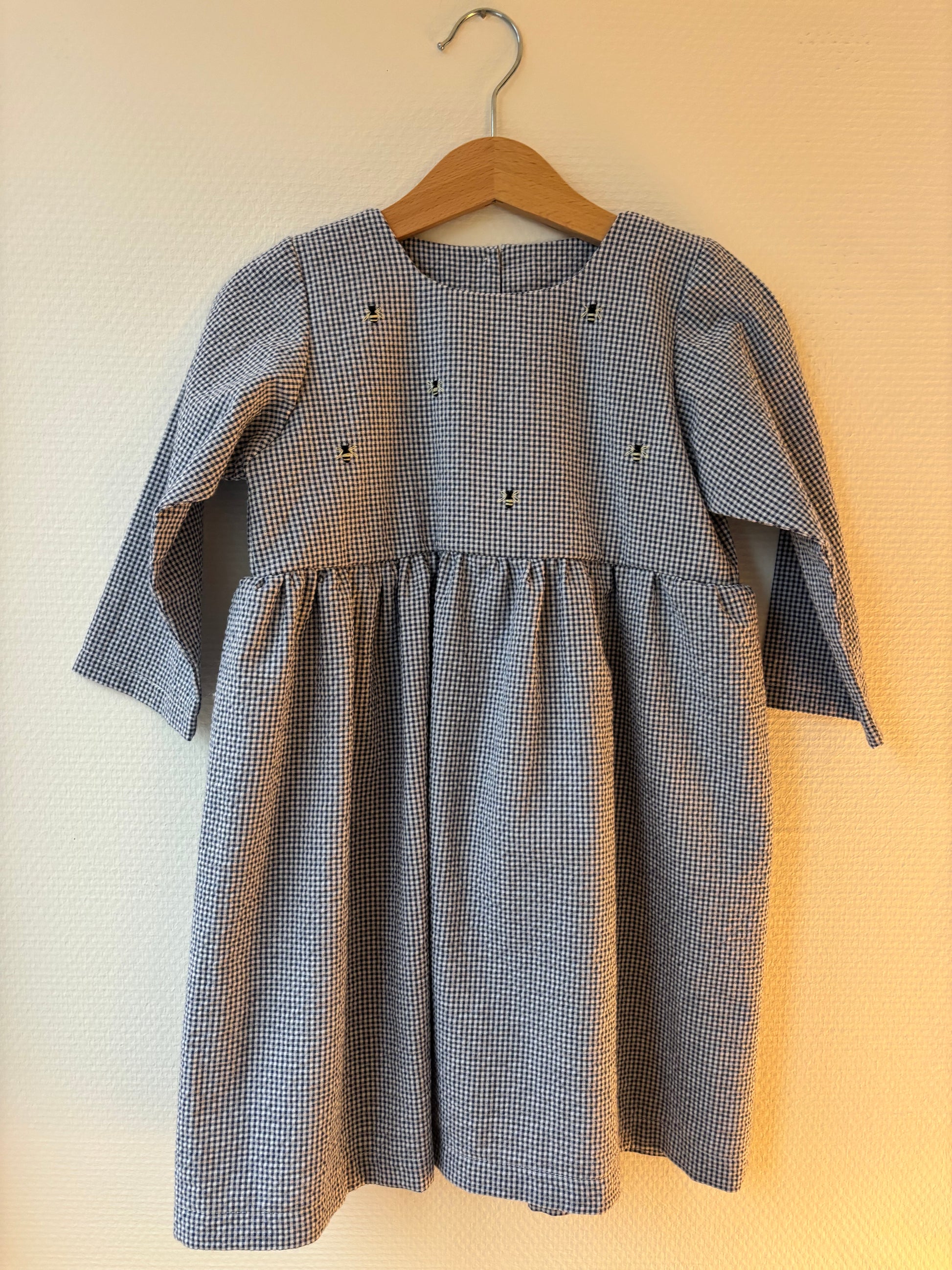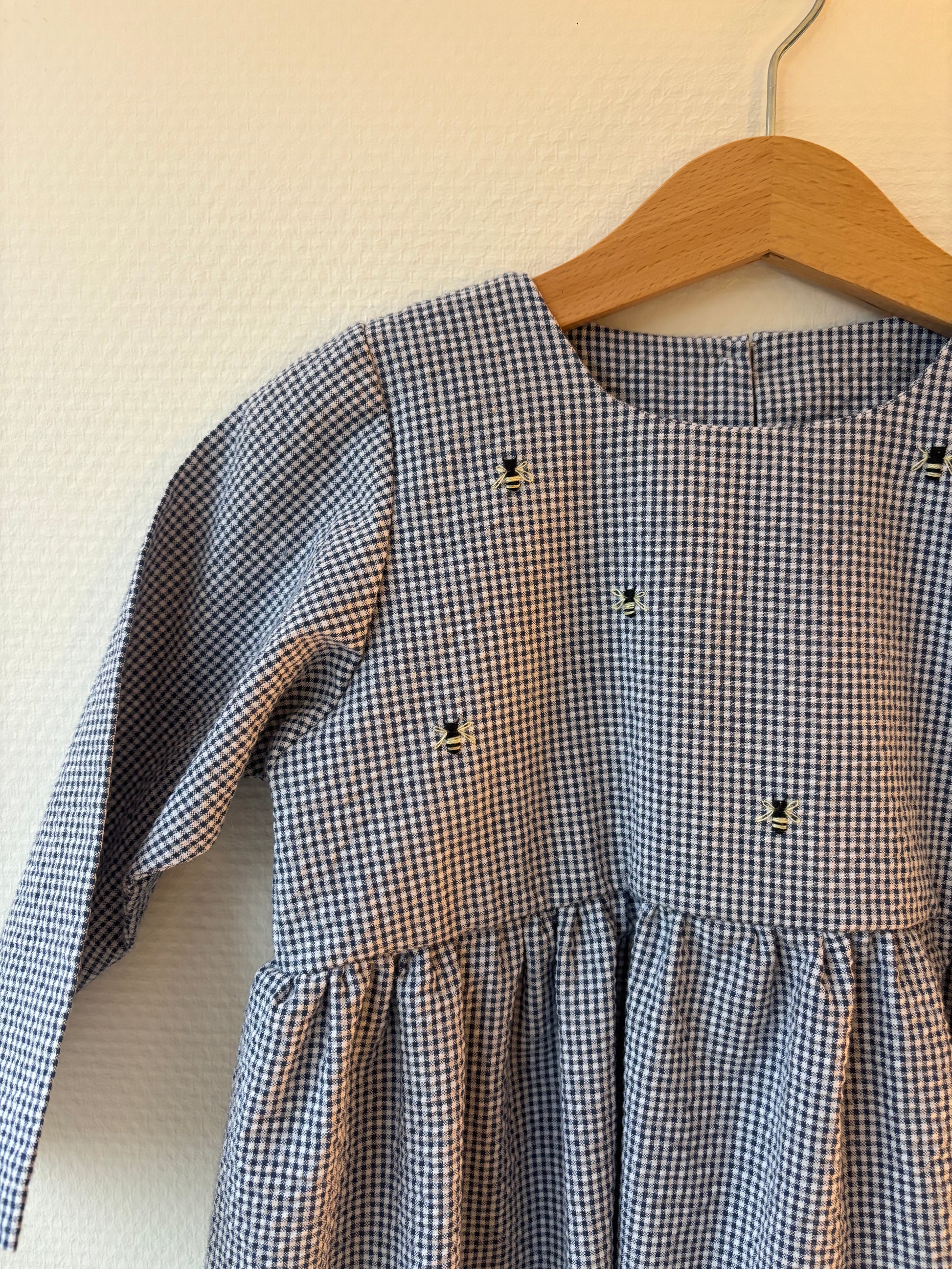 Blåternet kjole med håndbroderede bier på. Kjolen er behagelig at have på og giver god bevægelsesfrihed, som er perfekt til både hverdag, leg og særlige begivenheder.