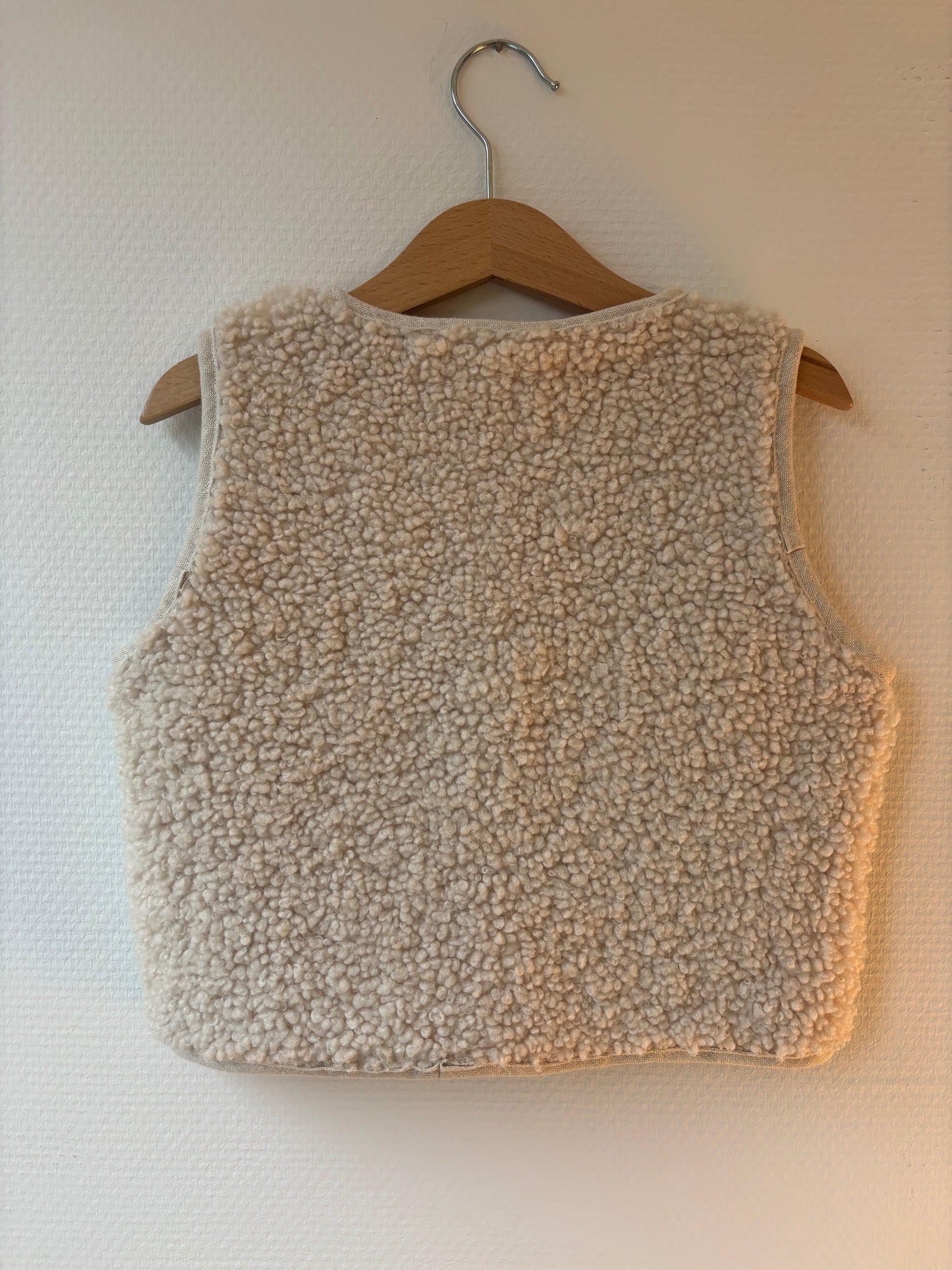 En fin grønternet vest med håndbroderede efterårsblade på. Vesten er let og behagelig at have på og giver god bevægelsesfrihed, hvilket gør den perfekt til både hverdag, leg og små eventyr.